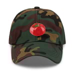 ArtxAdrienne "Tomato" Collection Camo Hat | A stylish urban chic artful pop of color, a fun tomato design on traditional camouflage print. Low profile with an adjustable strap and curved visor. One size.